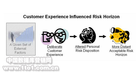 在給定的外部因素條件下 (或者像經(jīng)濟(jì)學(xué)家喜歡說的,如果外部因素保持不變),經(jīng)過深思熟慮和有持續(xù)性的客戶體驗將改變?nèi)藗兊娘L(fēng)險配置,并在一定程度上擴(kuò)大風(fēng)險容限。重新提高風(fēng)險容限的做法將導(dǎo)致客戶可接受風(fēng)險范圍呈現(xiàn)一定程度的放大。從理論上來說,客戶體驗考慮的越周到、持續(xù)性越好,那么客戶可接受的風(fēng)險范圍就越大。換句話說,F(xiàn)SB管理客戶體驗的能力越強(qiáng),客戶愿意承受的風(fēng)浪就越大。當(dāng)然,每個客戶都有自己的初始設(shè)定。我們得到的洞察是這個設(shè)定本身在某種程度上可以通過CEM進(jìn)行調(diào)節(jié)。