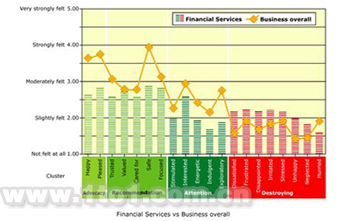 在上圖中,“綠色”代表推動價值的情感。“紅色”代表破壞價值的情感。反映在圖表上你當(dāng)然希望綠柱盡可能高一些 (比如,盡可能“非常強(qiáng)烈地感覺到”) 同時紅柱盡可能低 (盡可能接近“完全感覺不到”) 。黃線代表客戶對各種類型業(yè)務(wù)(B2B與B2C)的平均情感響應(yīng)。它是對普通客戶情感期望的最真實反映,也是客戶情感響應(yīng)的基準(zhǔn)。條紋柱狀體代表FSP總體的情感響應(yīng)。上圖反映的情況并不妙。因為FSP在“紅色”部分高于基準(zhǔn)而在“綠色”部分低于基準(zhǔn)。必須指出的是,任何一家企業(yè)的具體情況都有可能不同于這里呈現(xiàn)的行業(yè)整體情況。
