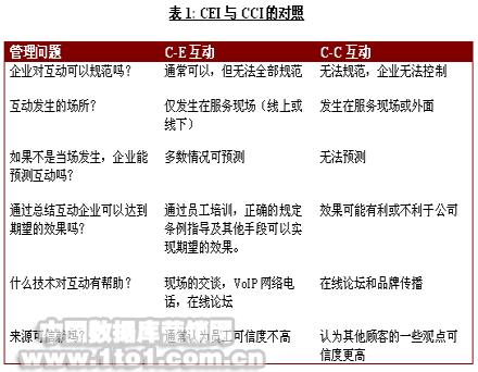 顯然,任何企業(yè)對(duì)員工的控制力遠(yuǎn)遠(yuǎn)超過(guò)對(duì)客戶的控制力。這意味著,員工參與的互動(dòng)可以在最大程度上得以規(guī)范和控制。例如,公司可培訓(xùn)員工如何接待一位惱怒的顧客或者如何處理違反規(guī)定的退貨。另一方面,客戶之間的互動(dòng),不一定發(fā)生在公司的營(yíng)業(yè)所?赡馨l(fā)生在外面,或者在虛擬的網(wǎng)絡(luò)社區(qū)。這些互動(dòng)是難以監(jiān)督,更不用說(shuō)去控制了。下面的表格中描述了CEI與CCI的主要區(qū)別。