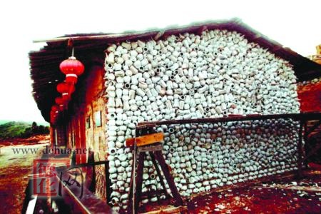 從窯場出來,忽然看到邊上一座特別的房子,整堵墻都是用各種樣式、大小不等的茶壺壘成。原來,幾個月前,十幾名外國人來到古窯旁邊,他們把附近窯口燒壞的次品茶壺?fù)斐鰜,搭成了?米多的白色茶壺墻壁。