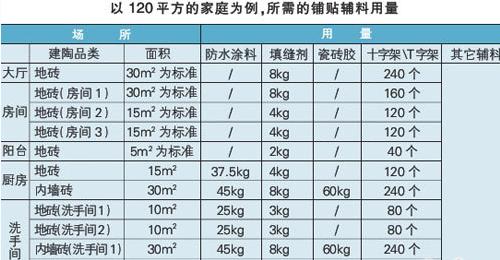1)以上為正常家庭的鋪貼鋪料用量。該計(jì)算方式僅按現(xiàn)有國(guó)內(nèi)現(xiàn)狀的使用情況。(防水僅用于廚房與洗手間;瓷磚膠也僅用于墻面鋪貼)