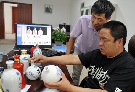 景德鎮(zhèn)酒瓶創(chuàng)意工廠的員工在設(shè)計新酒瓶
