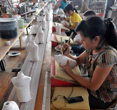 生產(chǎn)線上的工人在手繪青花瓷酒瓶