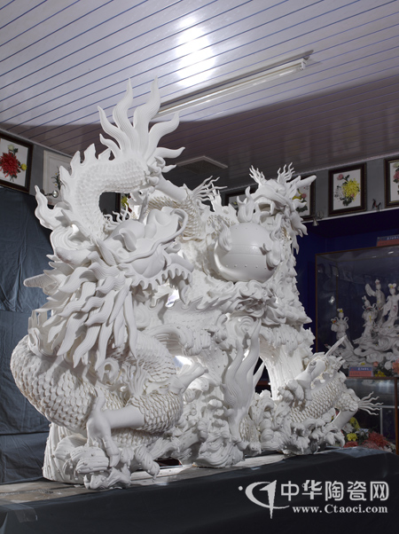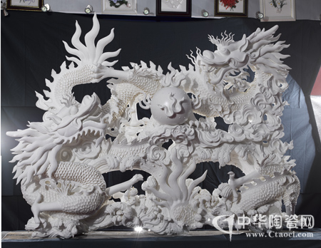 據(jù)兩兄弟介紹,他們?yōu)榱送黄频禄瘹v來的小型瓷雕創(chuàng)作,從2000年開始構(gòu)思,2003年開始燒制大型瓷雕《和諧中國》,每年燒制一尊,都因體積龐大容易變形、斷裂,直至近期才燒制成功。作品《和諧中國》長1.68米,寬1.27米,重約470斤,雙龍戲珠,造型和諧,以龍珠為中心雙龍對稱排列。