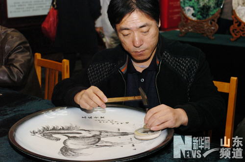 山東陶瓷藝人邢樹彬正在展示“刻瓷”技藝。