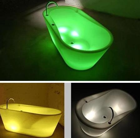 這種聚乙烯材質(zhì)的照明浴缸安裝有一組鹵素?zé),或者你也有其他的一個選擇,一組可以編程的色彩斑斕的LED燈。同時浴缸的整體顏色也有白色、熒光色、檸檬黃、紅色和粉紅色多種選擇。