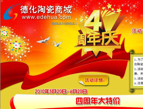 1、為了回饋廣大消費(fèi)者對(duì)陶瓷商城的支持,特在陶瓷商城四周年,推出特價(jià)商品。