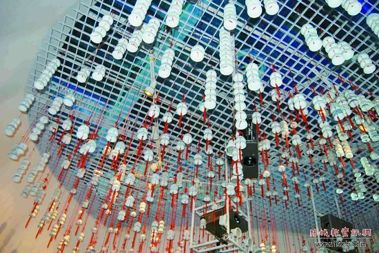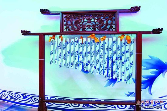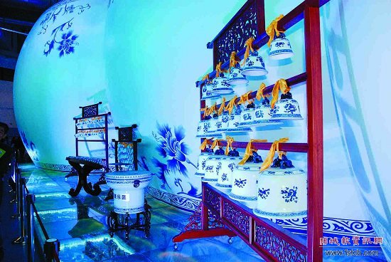 江西景德鎮(zhèn)館的入口處,懸掛著由瓷杯制作的風(fēng)鈴,叮叮當(dāng)當(dāng)?shù)穆曧懼,不意間就把你引入了陶瓷的世界。 江西館,青花陶瓷樂團(tuán),古香古色十足。 江西景德鎮(zhèn)館的青花瓷缶,真想上前擊打一……
