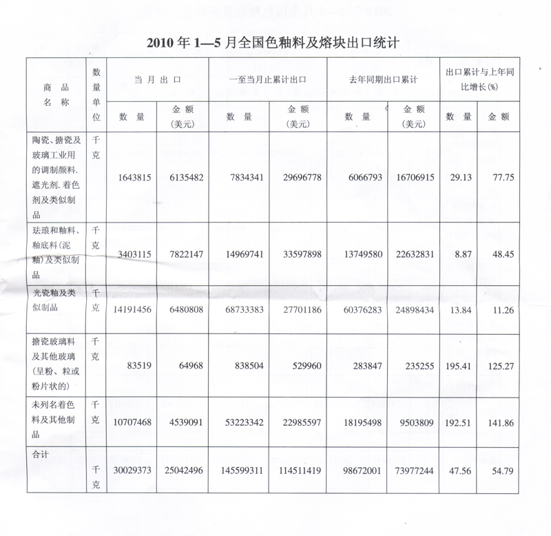 2010年1-5月全國色釉料及熔塊出口統(tǒng)計
