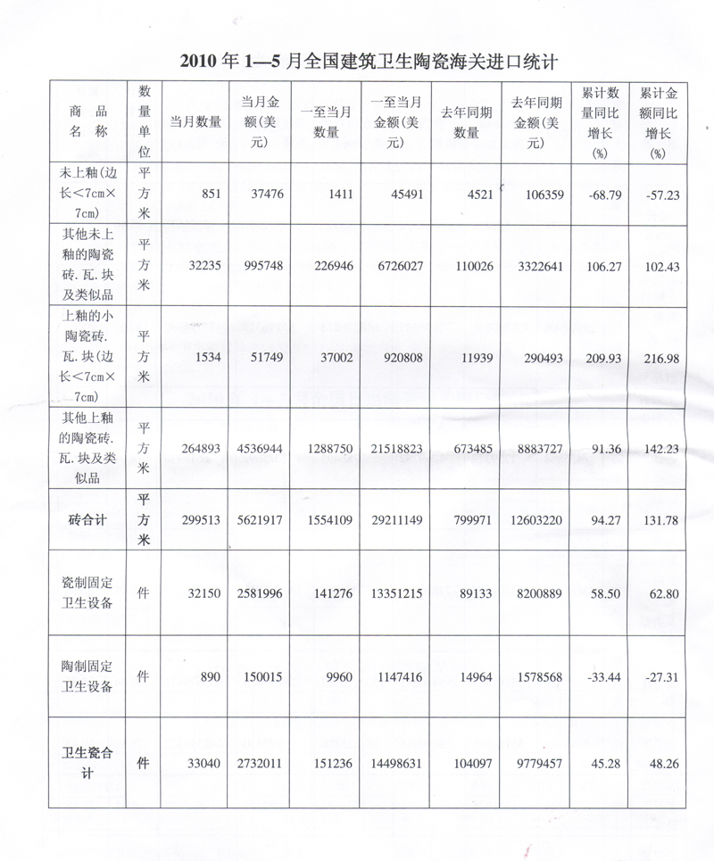 2010年1-5月全國建筑衛(wèi)生陶瓷海關(guān)進口統(tǒng)計