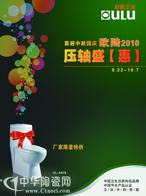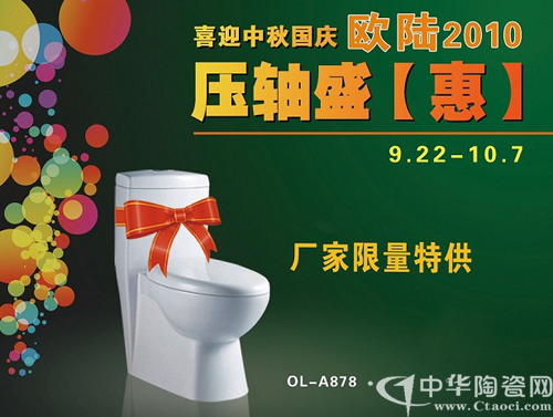 情滿中秋人團(tuán)圓,舉國(guó)同慶賀十一。值此佳節(jié),歐陸衛(wèi)浴奏響黃金周搜購(gòu)進(jìn)行曲,2010壓軸盛“惠”即將登場(chǎng),感恩消費(fèi)者長(zhǎng)期以來(lái)對(duì)歐陸衛(wèi)浴的支持與喜愛。