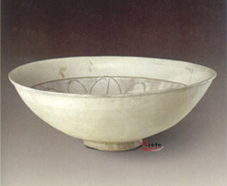 碗撇口、淺腹、圈足。外壁光素無紋,碗內(nèi)于釉上劃刻花紋,刀法深刻有力,線條粗獷灑脫,表現(xiàn)了北方民間瓷窯質(zhì)樸平實的裝飾風格。此種形制紋樣的碗,在河北省峰峰礦區(qū)內(nèi)的觀臺鎮(zhèn)窯址、彭城鎮(zhèn)窯址,都曾出土有大量的瓷器碎片的標本,是宋末金初北方廣大地區(qū)尋常百姓之家使用的日常器皿。