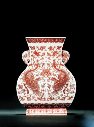 在翰海2010春拍中,一件清乾隆釉里紅雙鳳象耳扁方尊引起了拍家的關(guān)注,幾經(jīng)舉牌,終以336萬元人民幣的價格落槌。