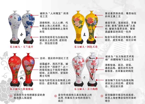 東方麗人系列產(chǎn)品,以麗人瓶為載體,以中國旗袍為設計元素,融合中國陶瓷四大經(jīng)典工藝(青花、釉下五彩、中國紅、帝王黃),將古代四大美女與四種名花、四個季節(jié)濃縮其中,和諧呈現(xiàn),盡展東方女性的靚麗與端莊。