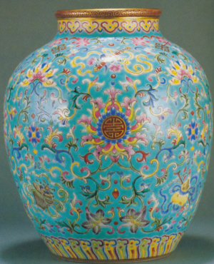 此件清嘉慶松石綠底粉彩暗八仙團(tuán)壽蓮紋太白罐,于北京保利2009年拍賣中以134.4萬元成交,罐高21cm,底有“大清嘉慶年制”六字三行篆書款,為嘉慶官窯燒造,器形豐滿,肩部和脛部飾如意紋,外壁施松綠釉為底,通體繪粉彩纏枝蓮、寶相花、暗八仙、描金壽字、云紋、“卍”字紋等紋飾,寓意吉祥,布局繁密,繪畫精湛,色彩富貴華麗,品相完好,實為難得,為嘉慶皇帝做壽之精品。
