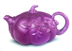 紫砂《南瓜壺》質(zhì)樸自然,南瓜葉翻卷成壺嘴,瓜蒂為壺蓋,瓜藤扭曲成壺把,在寂靜中感覺生命在律動(dòng),壺上葉蔓飄逸,好一派農(nóng)家田園的情趣。
