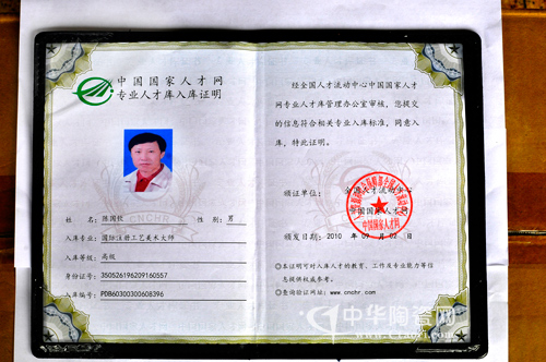 2010年9月2日,戴云藝瓷研究所所長兼藝術總監(jiān)、中國民間工藝大師、福建工藝美術學會會員、中華傳統(tǒng)工藝大師陳國欽被授予國際注冊工藝美術大師職業(yè)資格證書。
