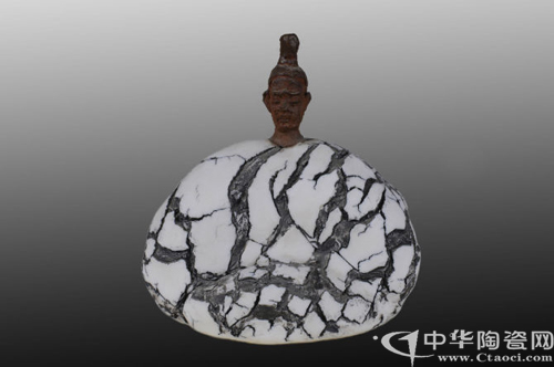 《武士》造型十分生動,特別是武士的頭部與身體部分在材料語言和技藝上的大寫意手法令人心曠神怡,即如國畫寫意,潑墨飛白之妙。身體部分保持著多年來持續(xù)著特有的創(chuàng)作方式,保留著德化陶瓷的原汁原味,即興而作,不再收拾,關(guān)鍵部位,點到位止。細心之人不難看出,其中分寸的拿捏,極其講究。體積雖然不大,但氣韻天成。既有現(xiàn)代構(gòu)成的意識,又頗具傳統(tǒng)的中國風味,蘇氏風格,既莊重,又諧趣,既高古,又時代。
