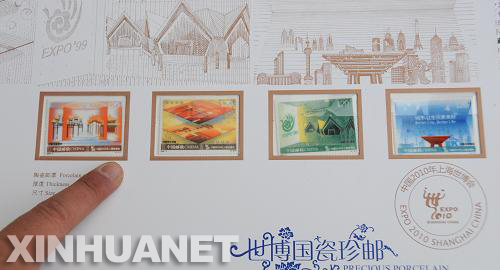 10月19日電 18日,2010年中國景德鎮(zhèn)國際陶瓷博覽會在江西景德鎮(zhèn)開幕,由中國集郵總公司發(fā)行的《世博國瓷珍郵》紀念冊在展會上亮相。這套紀念冊中有11枚陶瓷制成的郵票,以中國郵政發(fā)行的11枚上海世博會題材郵票為原形制作。(石衛(wèi)明 攝)