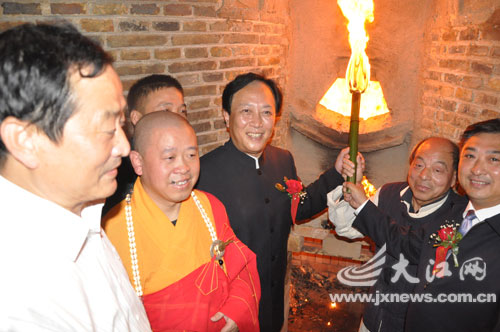 昨日上午11時(shí)許,剛剛修復(fù)成功的明代葫蘆窯在景德鎮(zhèn)市古窯民俗博覽區(qū)點(diǎn)火復(fù)燃,著名表演藝術(shù)家唐國(guó)強(qiáng)先生饒有興致地第一個(gè)將火把擲入窯火口。據(jù)悉,此次葫蘆窯燒造的陶瓷作品有1000余件,由景德鎮(zhèn)市一批陶瓷大師親手制作。不出意外的話(huà),此次復(fù)燒的葫蘆窯中的陶瓷將于22日開(kāi)窯認(rèn)證。