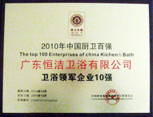 恒潔衛(wèi)浴入選“2010年中國廚衛(wèi)百強企業(yè)” 一方面表明恒潔衛(wèi)浴的行業(yè)地位得到了行業(yè)內部和消費者的充分肯定,另一方面也是恒潔衛(wèi)浴多年來孜孜不倦、嚴格要求的品質見證。