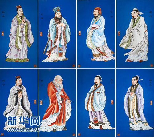 一套經(jīng)專家鑒定為清乾隆年間制作的圣人系列瓷版畫在北京發(fā)現(xiàn)(10月21日攝)。這套珍品共8名圣人,分別畫在8塊440厘米X800厘米的瓷版上。畫中的8位圣人分別是莊子、孔子、荀子、墨子(上排從左至右)與孫子、老子、孟子、韓非子(下排從左至右)。版畫制作精美、細膩,畫中人物飄逸,神采逼真,堪稱瓷版畫中的珍品。瓷版畫是中國陶瓷文化和繪畫文化的完美結合。始于唐,興于明清,盛于清末民初,是由藝術家在平板素瓷上手繪后,再經(jīng)高溫燒制而成;品種分青花、五彩、斗彩、粉彩等幾種形式,內容涉及人物、山水、花卉等。據(jù)傳在清末民初,達官貴人家中都用其做裝飾,或嵌在圍屏、插屏中,或鑲于掛屏上,以顯示主人的身份、財富和風雅。(記者 陳樹根)