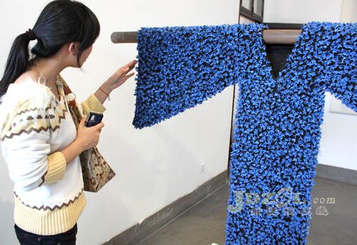 北京奧運會上的青花禮服再現(xiàn)了青花瓷的暈染效果,魚尾裙的廓形設(shè)計凸顯中國女性的柔美曲線。青花圖案一度成為人們繪制服裝的必備元素,記者近日在景德鎮(zhèn)市樂天陶社見到,一件陶瓷漢服采用青花高貴的藍(lán)色,將麻布以陶瓷作點綴制成一件漢服,相當(dāng)驚艷。