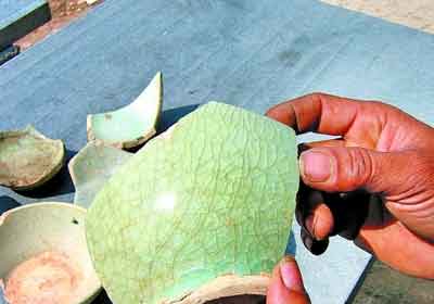 昨日上午,普查小組來到水庫,只見這里依山傍水,盛產(chǎn)高嶺土和釉水等礦產(chǎn)資源,具備燒制青瓷的條件。在水庫原儲水處發(fā)現(xiàn)了大量陶瓷片,堆積層厚達(dá)1至5米。普查組專家隨手拿起一件碎瓷,碗底有一個明顯的乳心。專家稱,這是明顯的元代青瓷特色。
