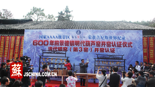 景德鎮(zhèn)古窯民俗博覽區(qū),10月22日上午,這里出現(xiàn)了彩旗招展、鑼鼓喧天、嘉賓滿座、記者云集的盛況。景德鎮(zhèn)第七屆國際陶瓷博覽會期間最令人矚目的活動——景德鎮(zhèn)明代葫蘆窯暨清代鎮(zhèn)窯(第3窯)復(fù)燒開窯認(rèn)證儀式在這里隆重舉行。