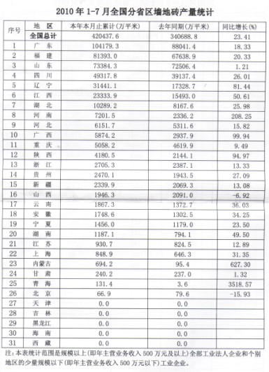 2010年1—7月全國分省區(qū)墻地磚產(chǎn)量統(tǒng)計