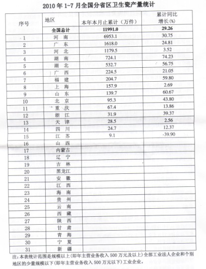 2010年1—7月全國(guó)分省區(qū)衛(wèi)生瓷產(chǎn)量統(tǒng)計(jì)