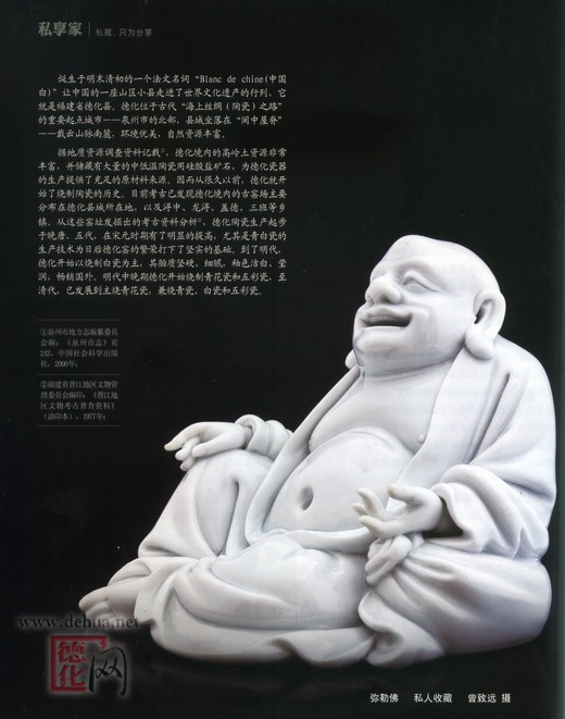 誕生于明未清初的一個(gè)法文名詞“Blanc de chine(中國白)”讓中國的一座山區(qū)小縣走進(jìn)了世界文化遺產(chǎn)的行列、它就是福建省德化縣。德化位于古代海上絲綢(陶瓷)之路”的重要起點(diǎn)城市——泉州市的北部,縣城坐落在“閩中屋脊”——戴云山脈南麓,環(huán)境優(yōu)美,自然資源豐富、據(jù)地質(zhì)資源調(diào)查資料記載①,德化境內(nèi)的高嶺土資源非常豐富并儲藏有大量的中低溫陶瓷用硅酸鹽礦石,為德化瓷器的生產(chǎn)提供了充足的原材料來源。因而從很久以前,德化就開始了燒制陶瓷的歷史。目前考古已發(fā)現(xiàn)德化境內(nèi)的古窯場主要分布在德化縣城所在地、以及潯中、龍潯、蓋德、三班等鄉(xiāng)鎮(zhèn)。從這些窖址發(fā)掘出的考古資料分析②,德化陶瓷生產(chǎn)起步于晚唐、五代,在宋元對期有了明顯的提高、尤其是青白瓷的生產(chǎn)技術(shù)為日后德化窖的繁榮打下了堅(jiān)買的基礎(chǔ)。到了明代,德化開始以燒制白瓷為主,其胎質(zhì)堅(jiān)硬、細(xì)膩釉色,潔白、瑩潤,暢銷國外。明代中晚期德化開始燒制青花瓷和五彩瓷、至清代、已發(fā)展到主燒青花瓷,兼燒青瓷、白瓷和五彩瓷。