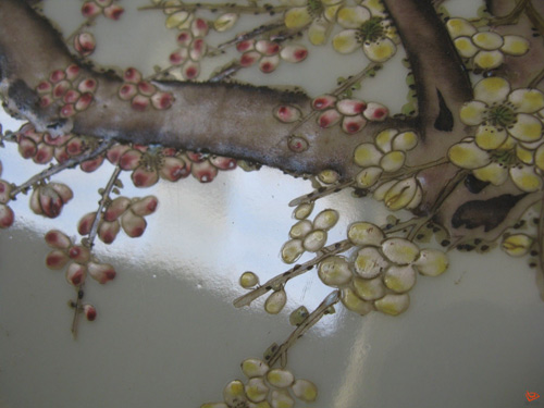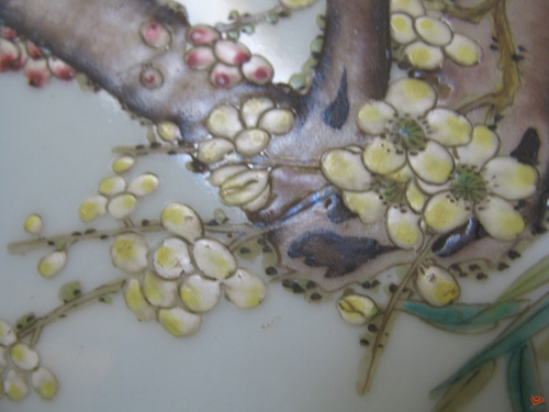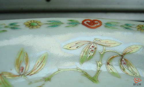“光暈”,不是鑒定真?zhèn)蔚囊罁?jù)。據(jù)筆者所知,現(xiàn)代景德鎮(zhèn)所燒粉彩瓷器都有光暈。是因為燒造溫度的關(guān)系。但若能細心比較、甄別和體會,能對老的光暈和新的光暈的物理表現(xiàn)有所區(qū)別的話,它亦不失為鑒定彩瓷真假的好依據(jù),尤其是明代五彩。