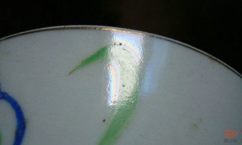 “蛤蜊光”,是指明清五彩、粉彩瓷器彩料周圍輪廓線在”白釉上“的一圈1~2mm的五彩光;或是沒有彩料,僅僅是在白釉上形成的不規(guī)則圓形五彩光。其主要形成原因是因為彩料里含有“鉛”,經(jīng)過近百年的時光,鉛被氧化所造成。蛤蜊光一般在明末(指天啟往后,嘉、萬五彩基本不見)、順治五彩,老康五彩、斗彩,雍正斗彩、粉彩(官窯的比民窯多見)和乾隆的粉彩等等上都可看到。晚清的五彩、粉彩上也看看到,但出現(xiàn)頻率不如三代。民國一些日用粉彩瓷器上亦十分常見。