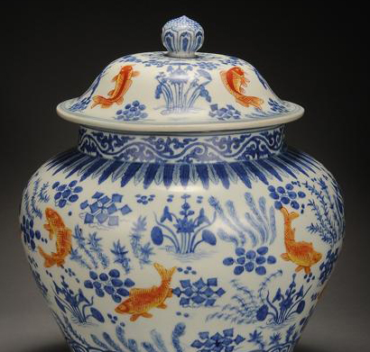 明嘉靖青花五彩魚(yú)藻紋蓋罐