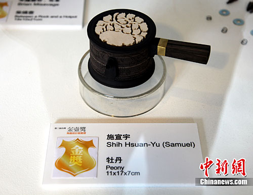 11月2日,第三屆臺(tái)灣金壺獎(jiǎng)陶藝設(shè)計(jì)競(jìng)賽展近日在臺(tái)北縣鶯歌鎮(zhèn)陶瓷博物館開幕。圖為展出的金獎(jiǎng)茶壺。中新社記者 陳立宇 攝