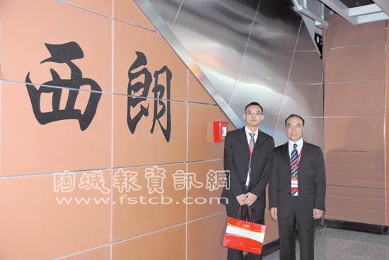 歐神諾陶瓷股份有限公司總經(jīng)理黃建起與工程銷售總經(jīng)理譚宜頌在開通首日試乘體驗地鐵至西朗站于晶立方前合影