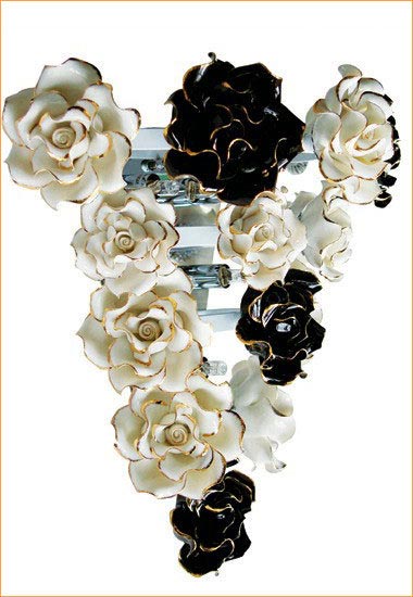 陶瓷的描金邊玫瑰花、不銹鋼鏡面、高亮白烤漆燈架,這三者交相輝映,絢麗奪目。重重疊疊的花叢造型,詮釋出了最為流行的波西米亞風(fēng)格,燈體造型典雅高貴亦不失時尚。