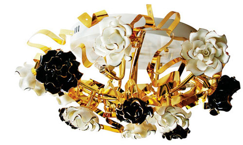 手工原色陶瓷材質(zhì)描金邊玫瑰花、24K 鍍金飾邊條,這些工藝讓這盞燈顯得更加璀璨奪目。高亮白烤漆、金屬吸頂盤,采用燈珠作為照明方式,極其美觀。