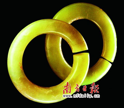 該玉耳飾直徑不到3厘米,中間有一條切口。朱乃誠說,“最初并不敢認(rèn)定這是一對耳飾,因為這對玉玦很重,但據(jù)宋代史料記載有女人的耳垂如雞腸,又從民族學(xué)的角度發(fā)現(xiàn)海南黎族人戴的耳環(huán)也很類似,才確定這是一對耳飾。正是因為太重了,才把女人的耳垂拉成了雞腸的樣子。”