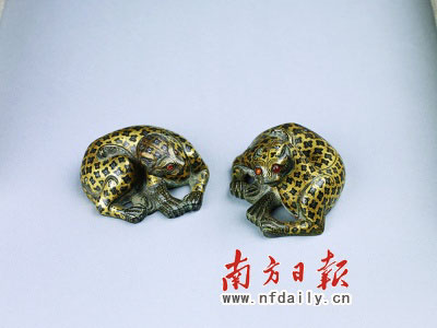 展覽中展出的河北省滿城漢墓的幾件文物均為精品。滿城漢墓是西漢中山靖王劉勝及其妻竇綰之墓,三國劉備自稱劉勝后代。展覽中,一對錯金銅豹最為奢華精美。兩只銅豹形象生動,雙眼鑲嵌紅寶石,身上錯金的斑細致入微,雖然通高只有3.6厘米,但是熠熠奪目。
