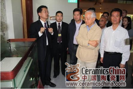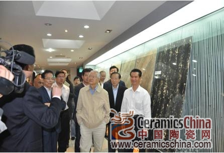 調(diào)研組一行首先來到輕質(zhì)新型建材館,張旗康董事詳細(xì)為調(diào)研組介紹了目前國內(nèi)唯一、代表世界最先進(jìn)水平的新型建材--建筑陶瓷薄板(PP版)和無機(jī)輕質(zhì)板材(QQ板)。當(dāng)了解到浮在魚缸中的無機(jī)輕質(zhì)板(QQ板)50%以上的原料為陶瓷工業(yè)廢渣,具備防火、隔音等多種功能以后,調(diào)研組人員都驚嘆當(dāng)今民營企業(yè)的創(chuàng)新之舉。此外,工作人員還現(xiàn)場演示了3.5mm的PP板,其韌性和硬度令在場人員折服,而各種不同風(fēng)格和堪比天然石材的表面裝飾效果更令調(diào)研組人員大加贊嘆。吳敬璉專家對蒙娜麗莎作為主起草人的《陶瓷板》、《建筑陶瓷薄板應(yīng)用技術(shù)規(guī)程》兩項(xiàng)國家標(biāo)準(zhǔn)頗感興趣,對兩項(xiàng)標(biāo)準(zhǔn)的起草程序等關(guān)鍵環(huán)節(jié)提出了疑問,在場的陶瓷行業(yè)專家陳帆教授一一做了解答,并就建筑陶瓷行業(yè)相關(guān)標(biāo)準(zhǔn)的制
