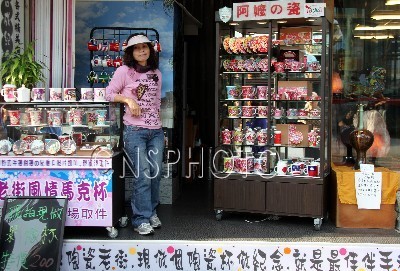 臺(tái)灣制陶業(yè)重地所在的臺(tái)北縣鶯歌鎮(zhèn)陶瓷老街,經(jīng)重新規(guī)劃后,而今已成為吸引各方來(lái)客的休閑好去處。數(shù)百米老街上,鱗次櫛比地開(kāi)著百余家陶瓷店鋪,和眾多陶藝工作室、老作坊、廠(chǎng)家直營(yíng)門(mén)市、批發(fā)店等,引人步入密集的陶瓷世界。圖為陶瓷店鋪的阿嬤在店門(mén)前以“伴手禮”概念招徠顧客。