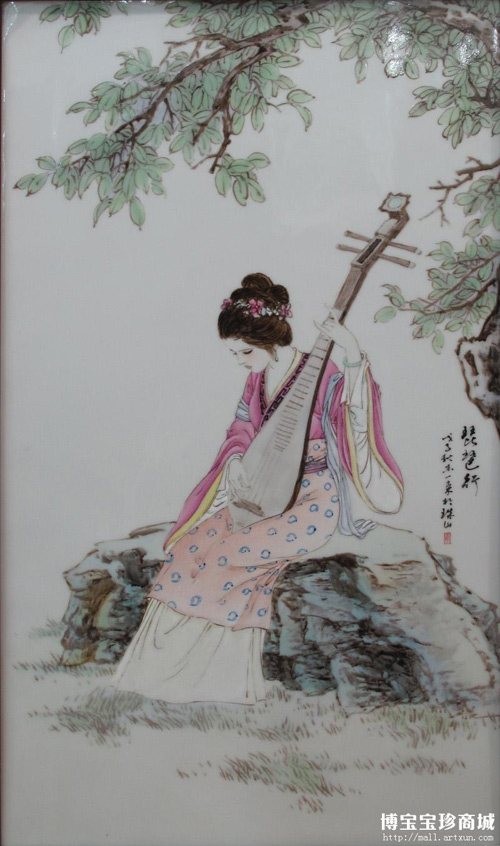 瓷板畫(huà)便于表現(xiàn)中國(guó)畫(huà)的神韻和意味,符合中國(guó)人傳統(tǒng)的審美習(xí)慣和審美趣味。這件瓷板畫(huà)《琵琶行》也是出自李一來(lái)先生之手,收藏于博寶寶珍商城。粉彩的演繹將女子形象渲染的婉約迷人,畫(huà)中的女子婉約動(dòng)人,低首彈著琵琶,樹(shù)上枝繁葉茂,畫(huà)面十分唯美,我們仿佛隱隱約約能聽(tīng)見(jiàn)琵琶聲,畫(huà)中的每一個(gè)細(xì)節(jié)都展現(xiàn)著精湛的工藝,實(shí)屬瓷板畫(huà)中的精品。(博寶藝術(shù)評(píng)論員 孫瑞峰 撰文)