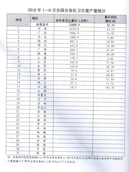 2010年1—8月全國(guó)分省區(qū)衛(wèi)生瓷產(chǎn)量統(tǒng)計(jì)