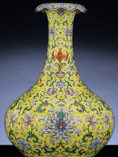 佳士得拍品 清嘉慶 黃地粉彩福壽萬(wàn)年云口瓶