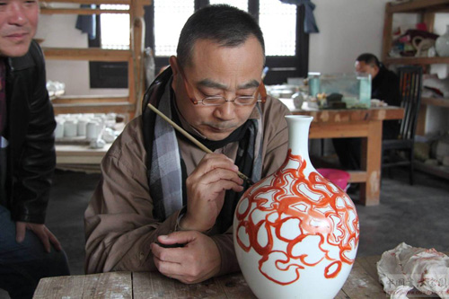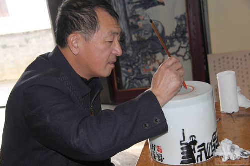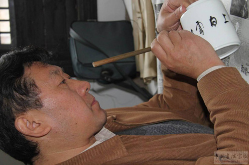 采風團成員吳勇進行陶瓷書畫創(chuàng)作
