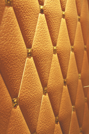 新中源展廳中展示的仿皮革瓷磚實景,與真的皮革在視覺效果甚至是表面顆粒上幾乎毫無差別。