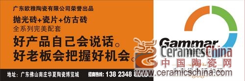 2010年陶瓷行業(yè)收官力作——珈瑪陶瓷(Gammar)驚艷出世,集拋光磚、瓷片、仿古磚全系列完美配套于一體,為“建陶航母”廣東歐雅陶瓷企業(yè)順應(yīng)市場(chǎng)需求,搶占“十二五”制高點(diǎn),“推進(jìn)城鎮(zhèn)化”,“把擴(kuò)大消費(fèi)需求作為擴(kuò)大內(nèi)需的戰(zhàn)略重點(diǎn),進(jìn)一步釋放城鄉(xiāng)居民消費(fèi)潛力”,新推的鉆石級(jí)高端品牌,為廣大陶瓷經(jīng)銷商財(cái)富加碼,為廣大消費(fèi)者幸福生活加碼。