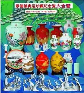 在北京奧運會成功舉辦一周年之際,千年瓷都景德鎮(zhèn)聯(lián)合北京匡時國際拍賣有限公司舉辦了“世紀(jì)華彩——奧運特許珍藏紀(jì)念瓷” 拍賣會,推出了《世紀(jì)華彩-金壁丹霞》珍藏瓷、《29款奧運運動項目陶瓷擺件》、絕版的《景德鎮(zhèn)奧運特許珍藏紀(jì)念瓷大全套》等經(jīng)典作品。“大全套”由83種162款產(chǎn)品組成,每套共計495件,并由公證機(jī)關(guān)權(quán)威公證。拍賣會非常成功,上拍作品幾乎全部成交,而且許多品種以高于起拍價數(shù)倍的價格成交。業(yè)內(nèi)一致認(rèn)為,此舉標(biāo)志著被譽為“當(dāng)代官窯”產(chǎn)品的景德鎮(zhèn)奧運藏瓷正式進(jìn)入高端收藏市場。